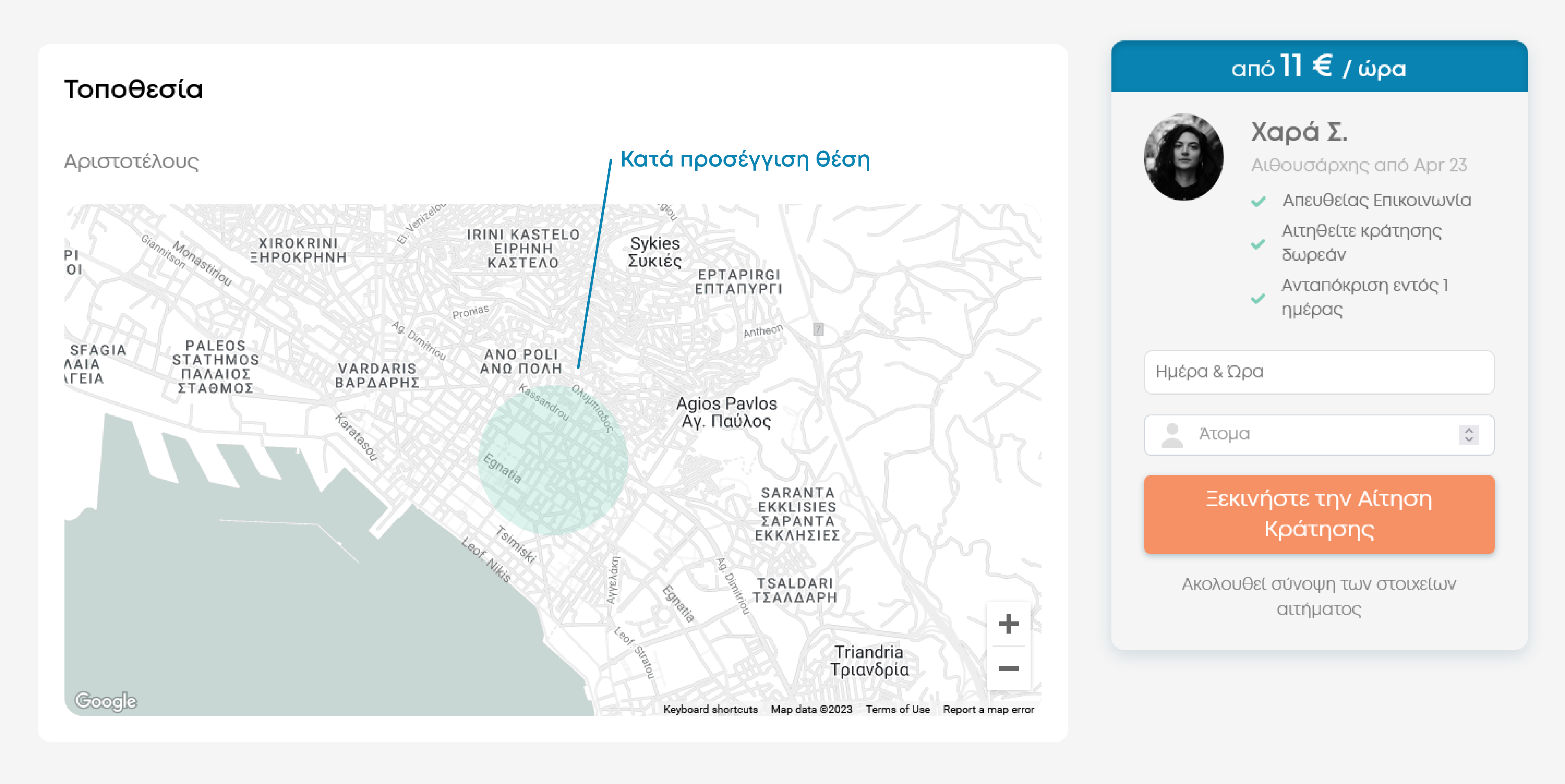 Η ακριβής τοποθεσία της αίθουσας αποκαλύπτεται από τον Αιθουσάρχη μόλις προχωρήσετε στην κράτηση της (ένα -δωρεάν- βήμα μετά το δωρεάν αίτημα διαθεσιμότητας). Αυτό που μπορείτε να δείτε στην αντίστοιχη ενότητα «Τοποθεσία» της 'Σελίδας Αίθουσας' είναι μια προσέγγιση της περιοχής.