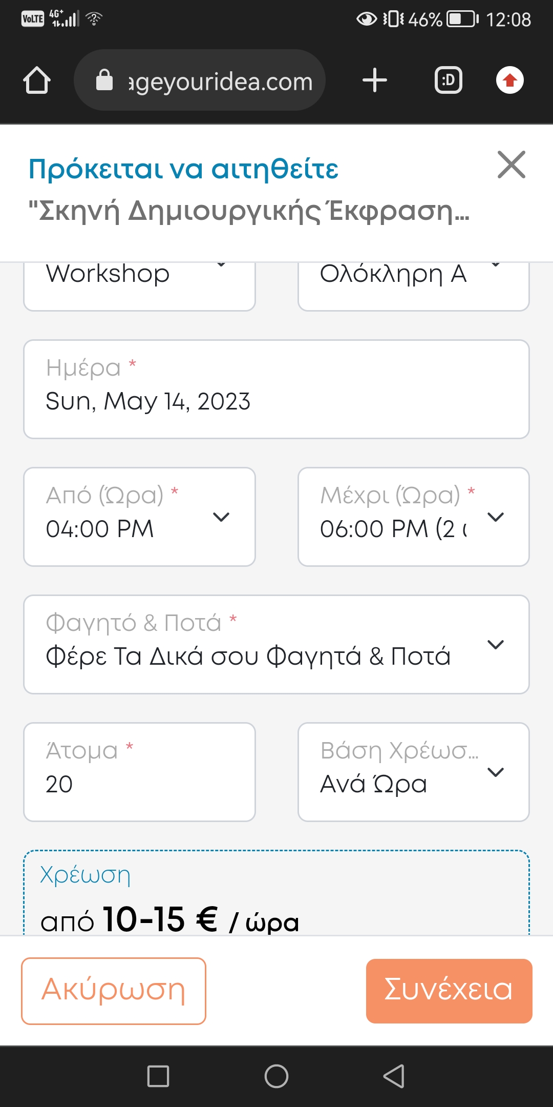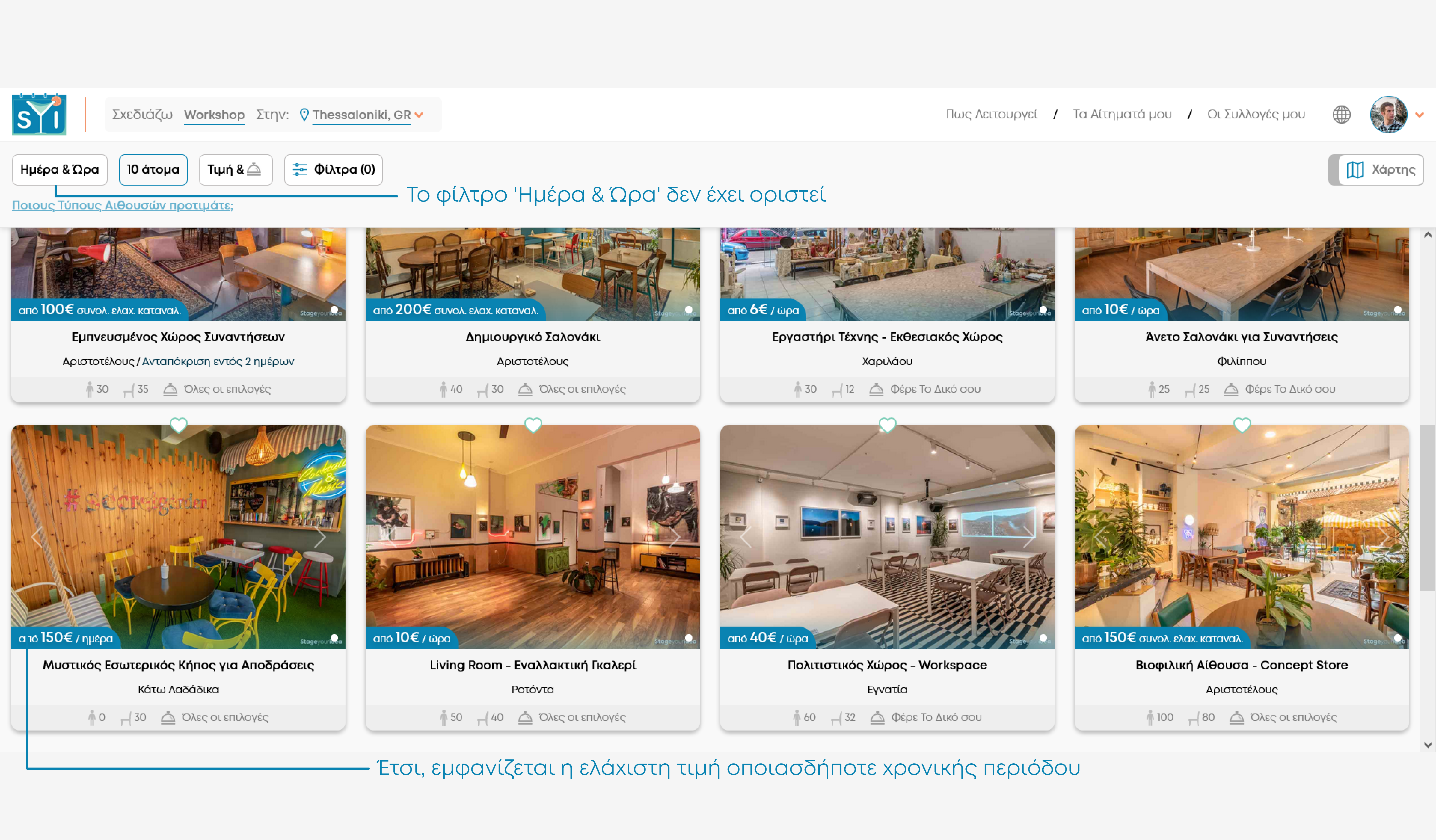 Για παράδειγμα, στα παραπάνω στιμιότυπα δεν δίνεται επιλογή για ‘συνολική ελάχιστη καταναλ.’, αλλά υπάρχουν επιλογές Φαγητού & Ποτού (π.χ. διάλειμμα για καφέ) που θα χρεωθούν επιπλέον της ωριαίας μίσθωσης