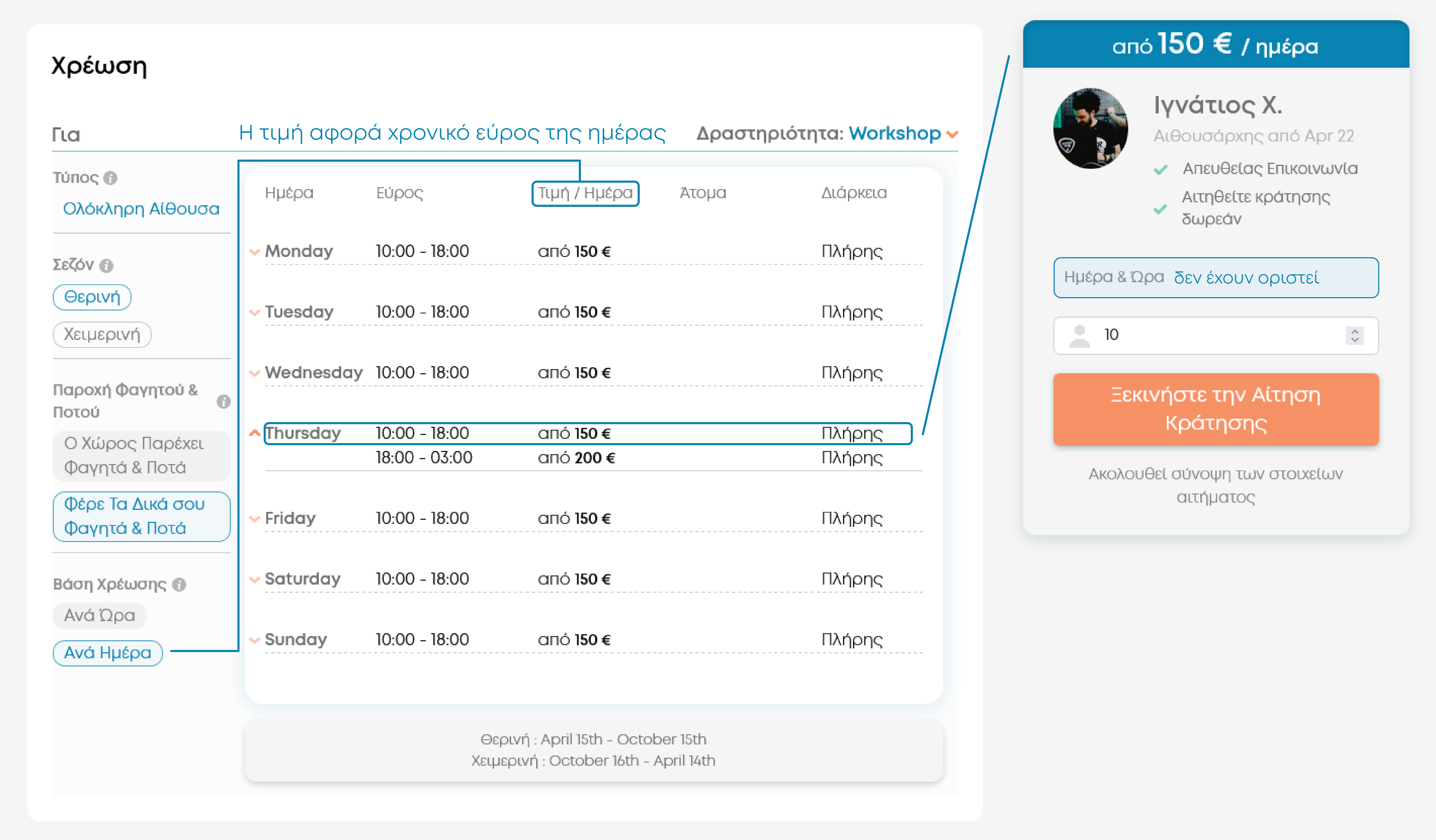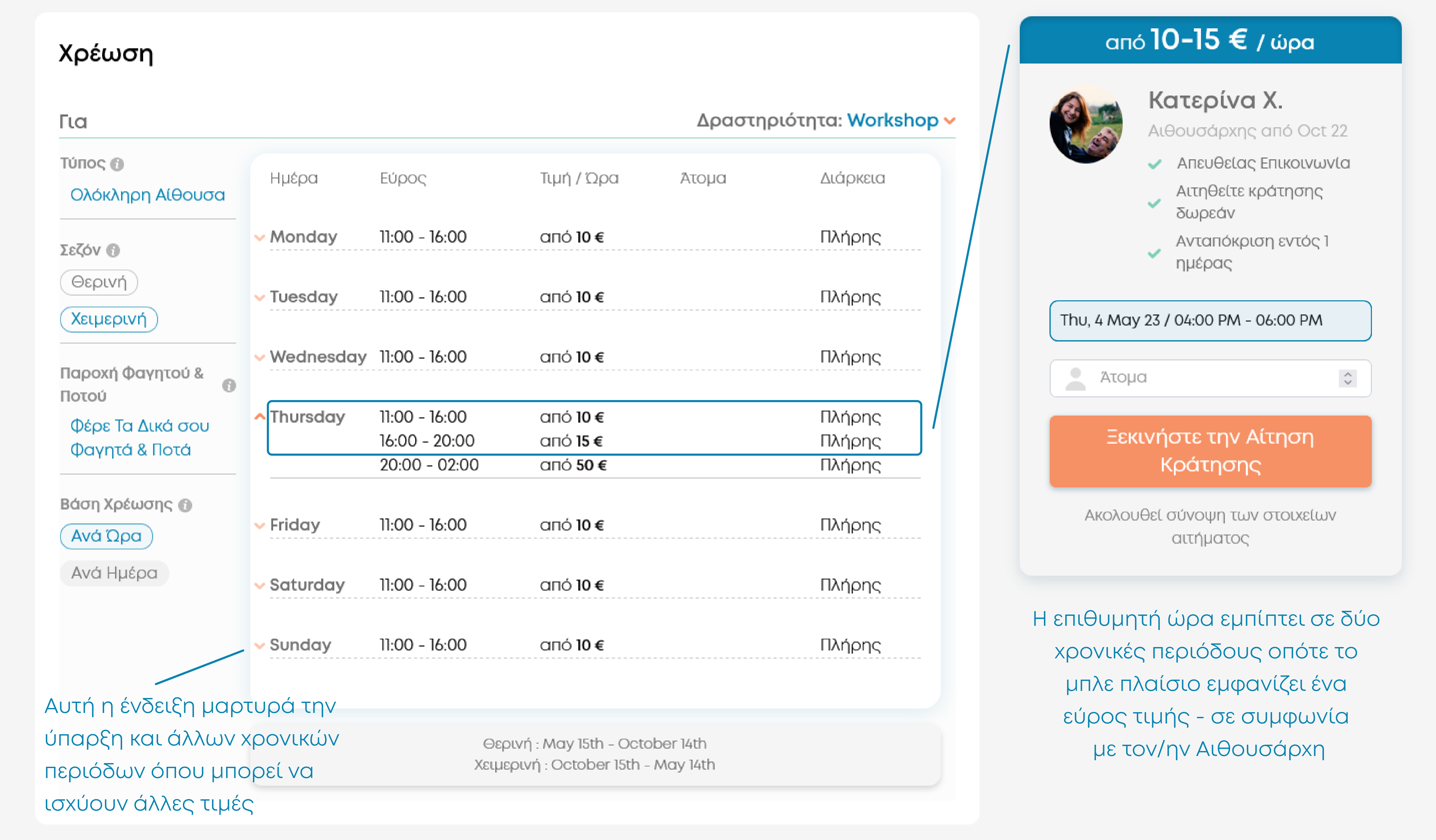 ημέρα & ώρα που σας ενδιαφέρει, συν τη σεζόν (εάν ο/η Αιθουσάρχης έχει θέσει την εποχικότητα σαν παράγοντα που επηρρεάζει τη χρέωση).