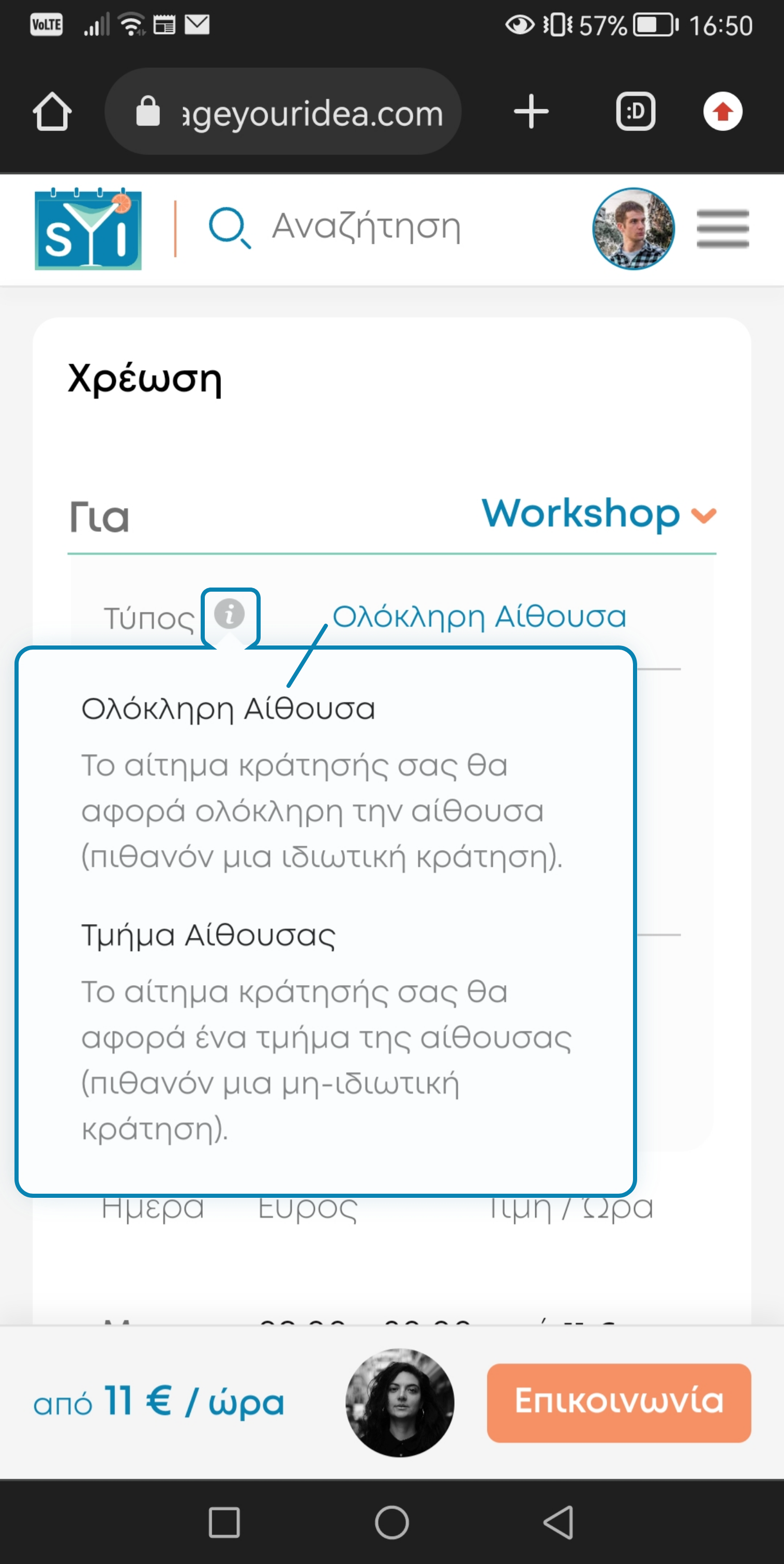 τον τύπο της μίσθωσής σας ('Ολόκληρη Αίθουσα' = ιδιωτική ή 'Τμήμα Αίθουσας' = μη ιδιωτική),