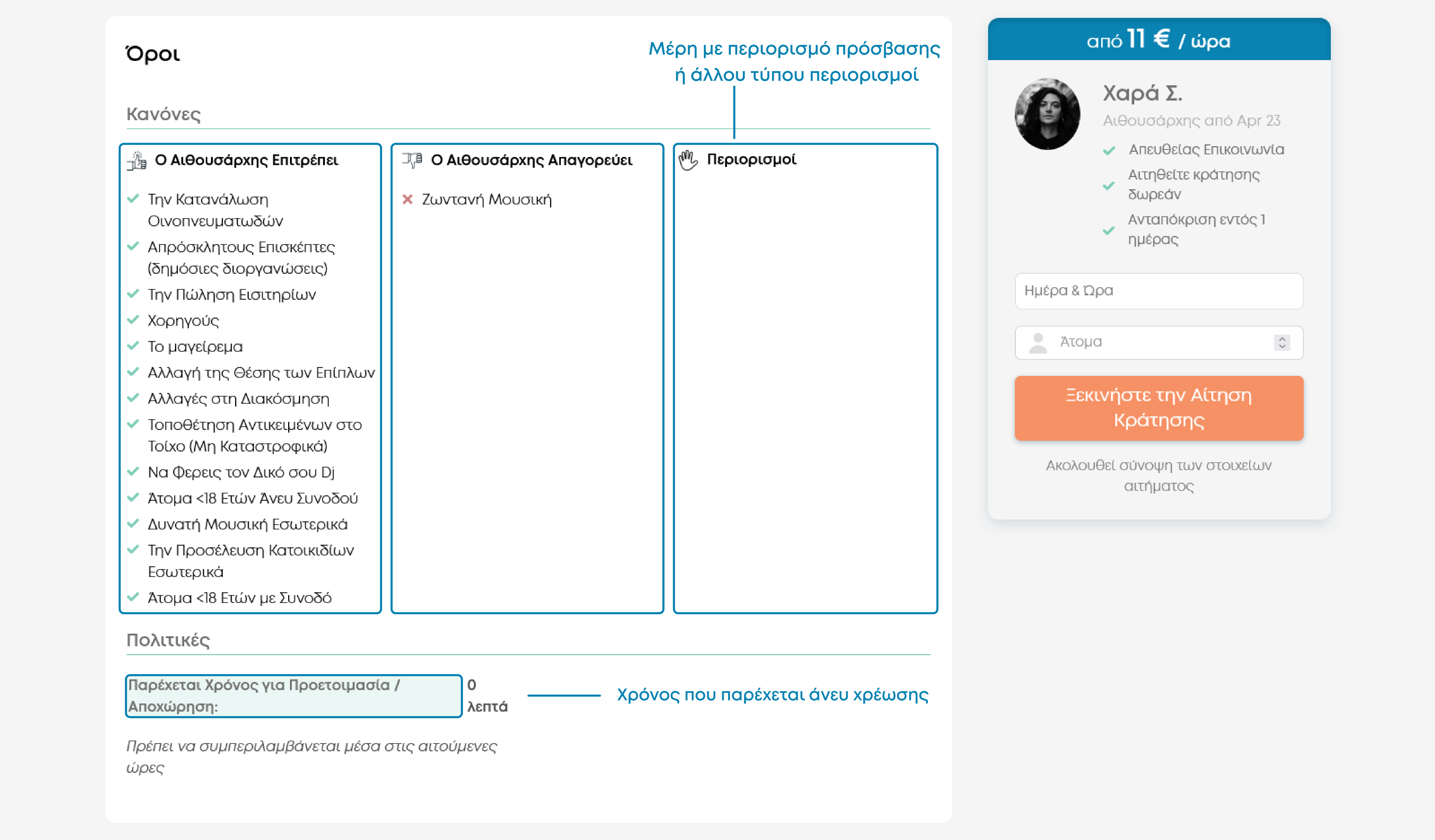 Η ενότητα ‘Όροι’ βρισκεται στην ‘Σελίδα Αίθουσας’ και στοιχειοθετεί τους κανόνες συμπεριφοράς ώστε να είναι αποδεκτή η διοργάνωση της δραστηριότητά σας. Κάθε Αιθουσάρχης ενθαρρύνεται να θέσει οποιοδήποτε είδος περιορισμού διατηρεί ώστε να ενημερώνεστε εκ των προτέρων για τον βαθμό ελευθερίας σας και των καλεσμένων σας.