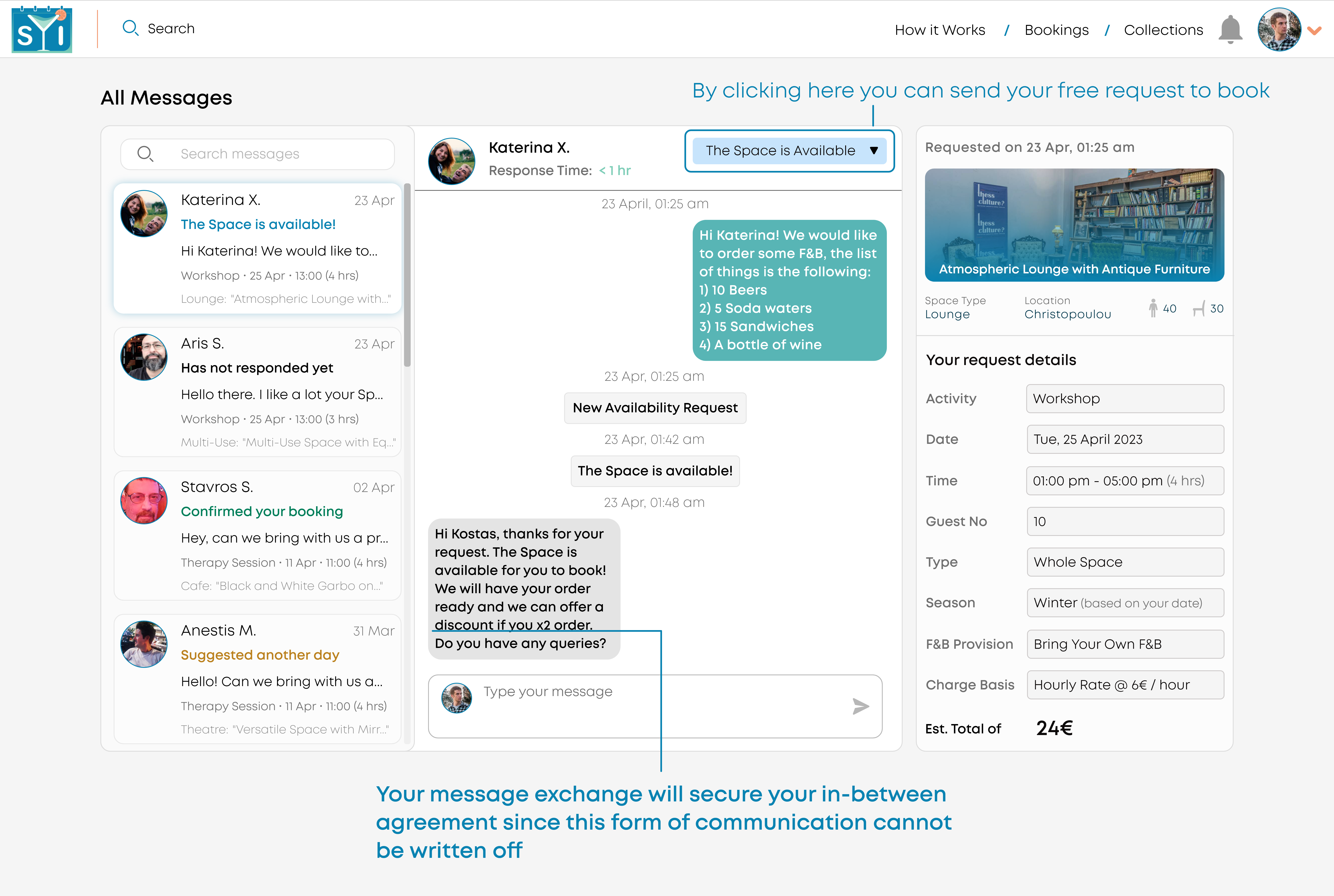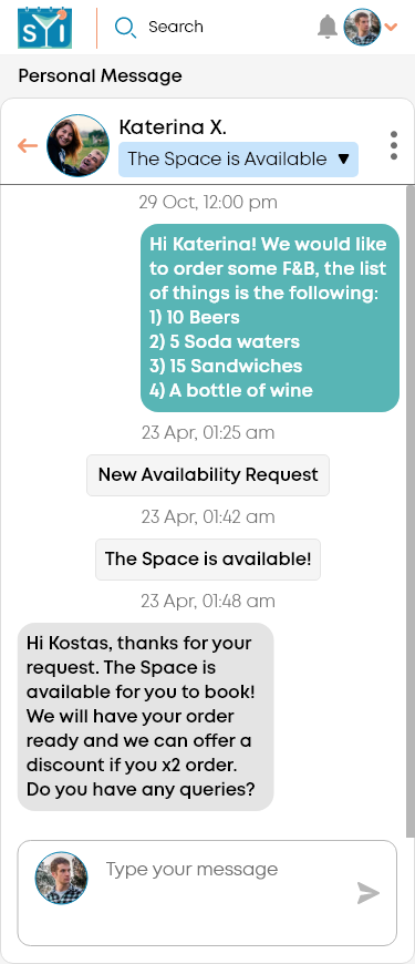 You can chat with a Venue Host only once the Space(s) you have send your free availability request has been marked as being ‘available’ for your desired date & time.