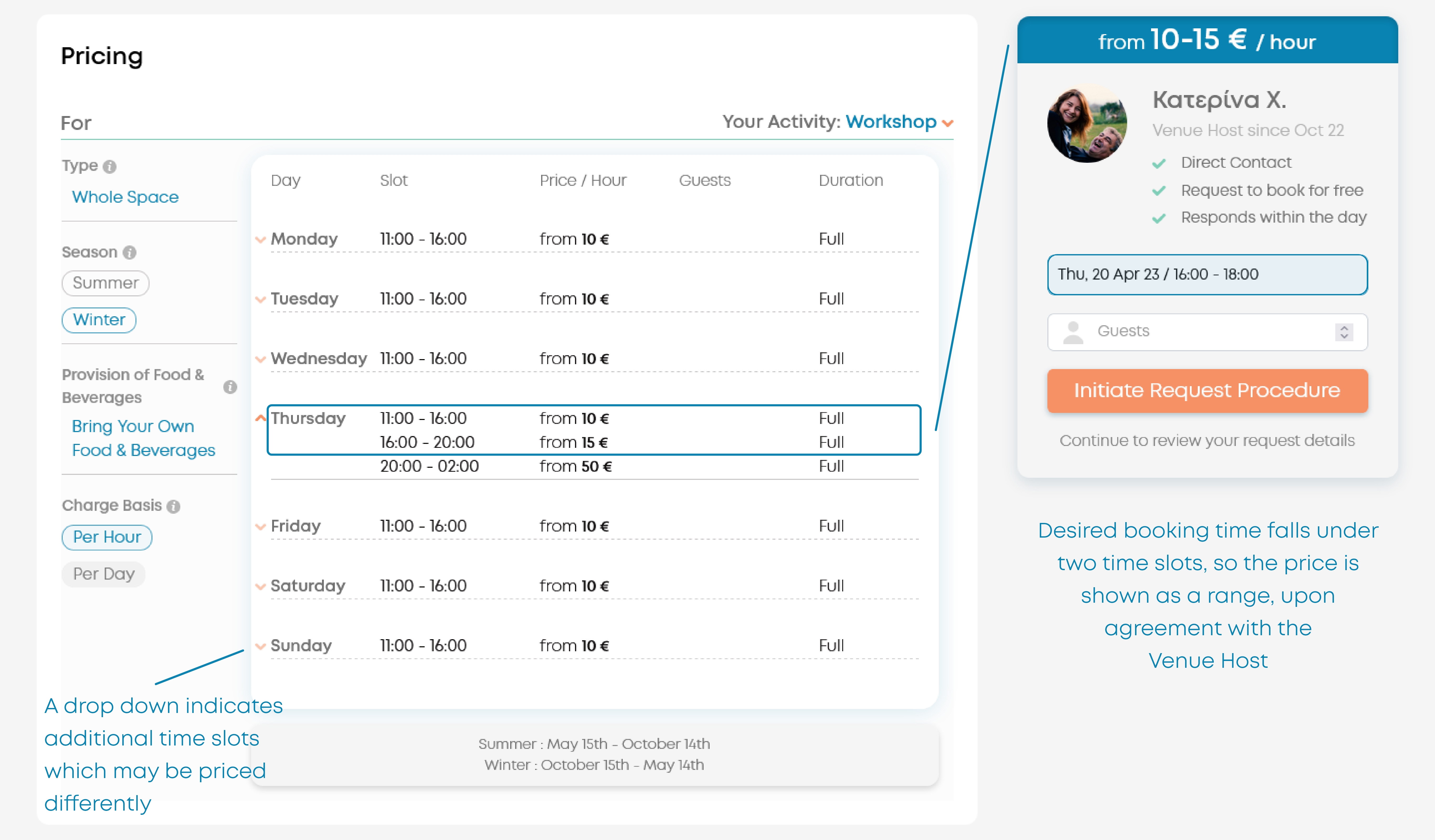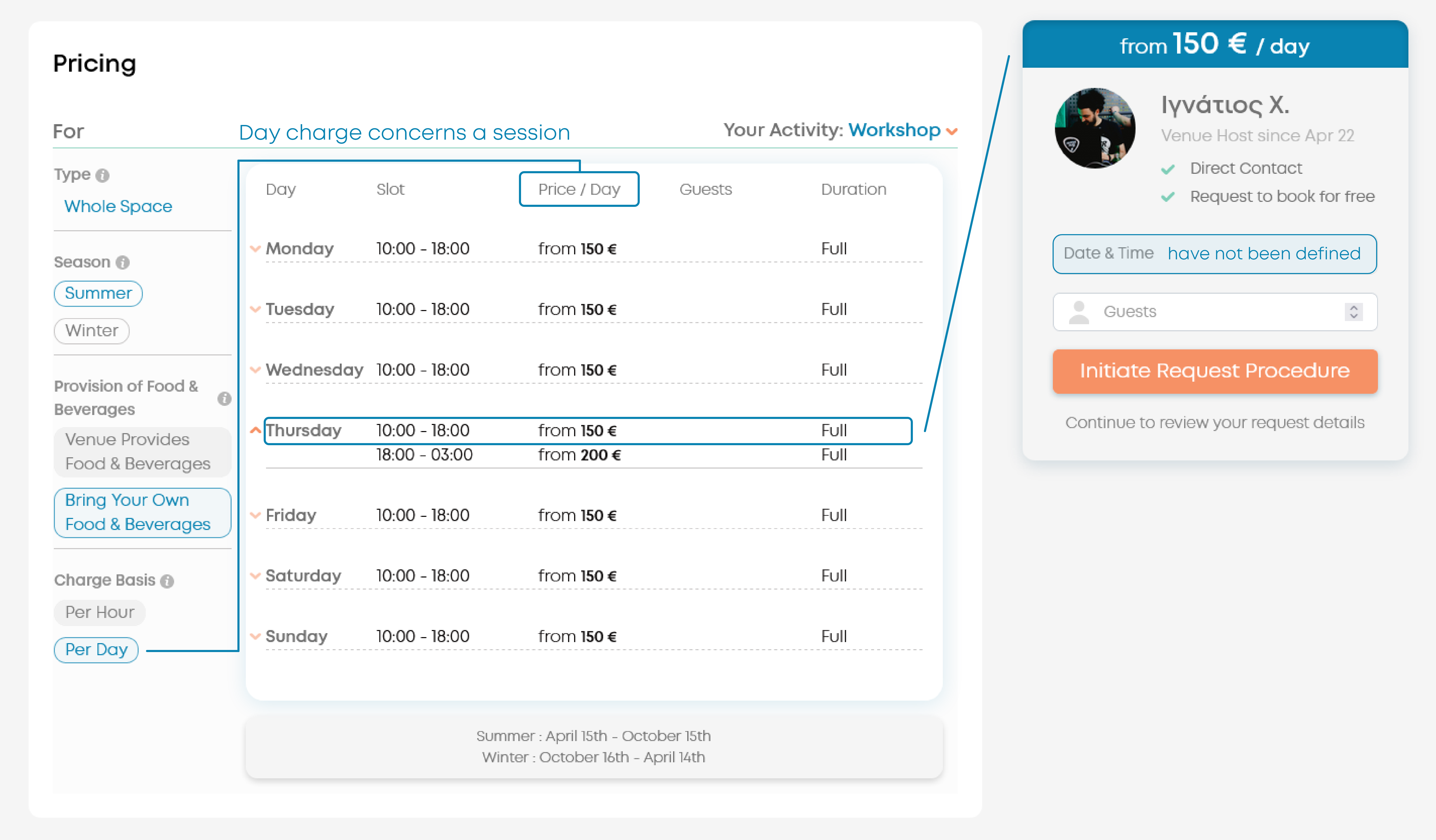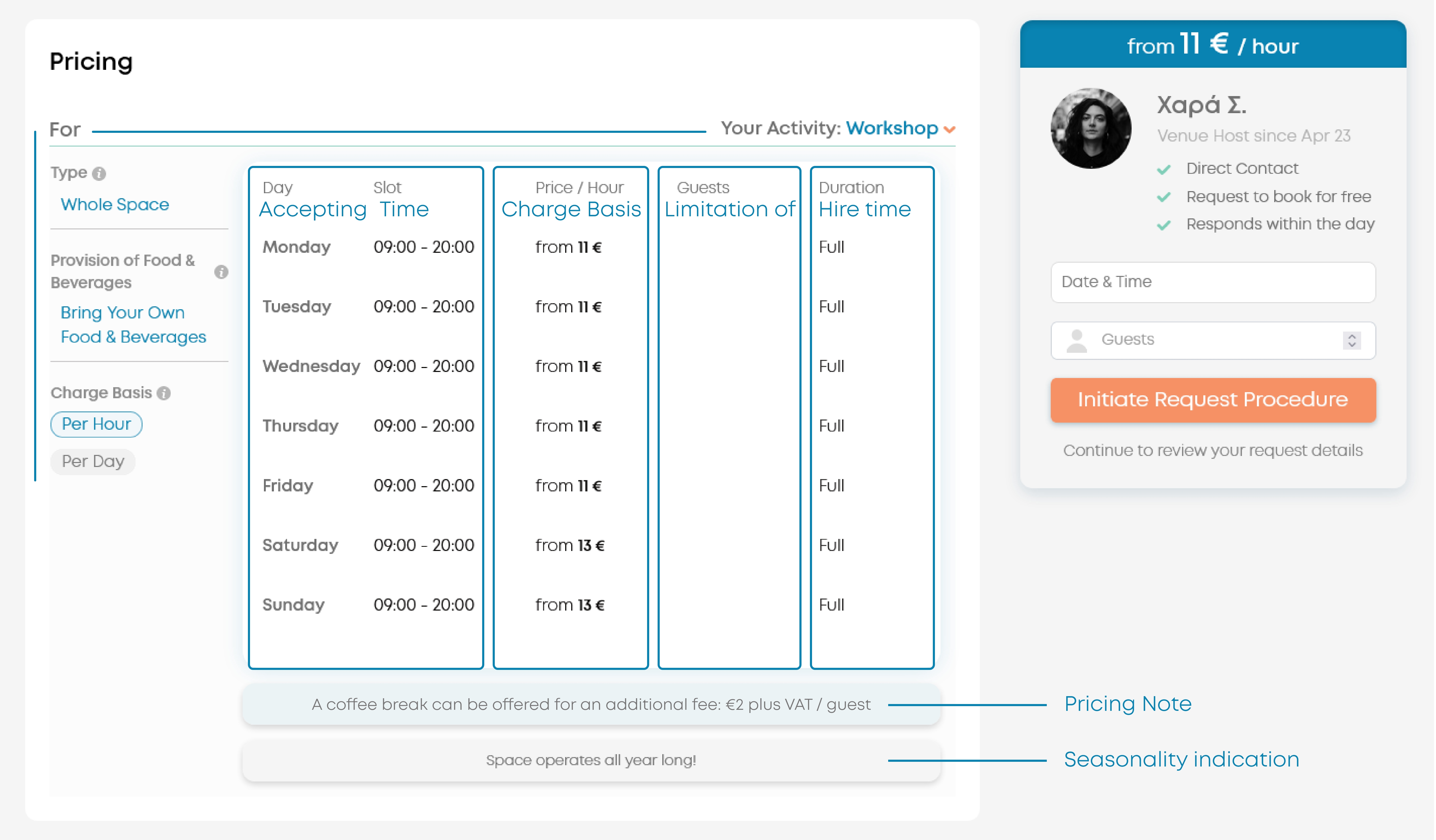 In the desktop view of our web app, the Request box, where Venue Host’s photo can be seen, is linked with the ‘Pricing’ section meaning when you enter your desired date & time, the pricing preview (blue box where €€ is shown) will be updated according to your selected options.