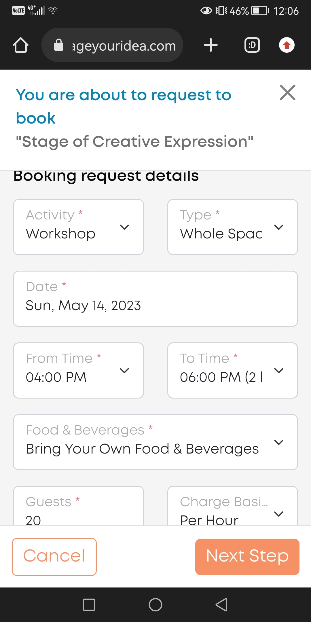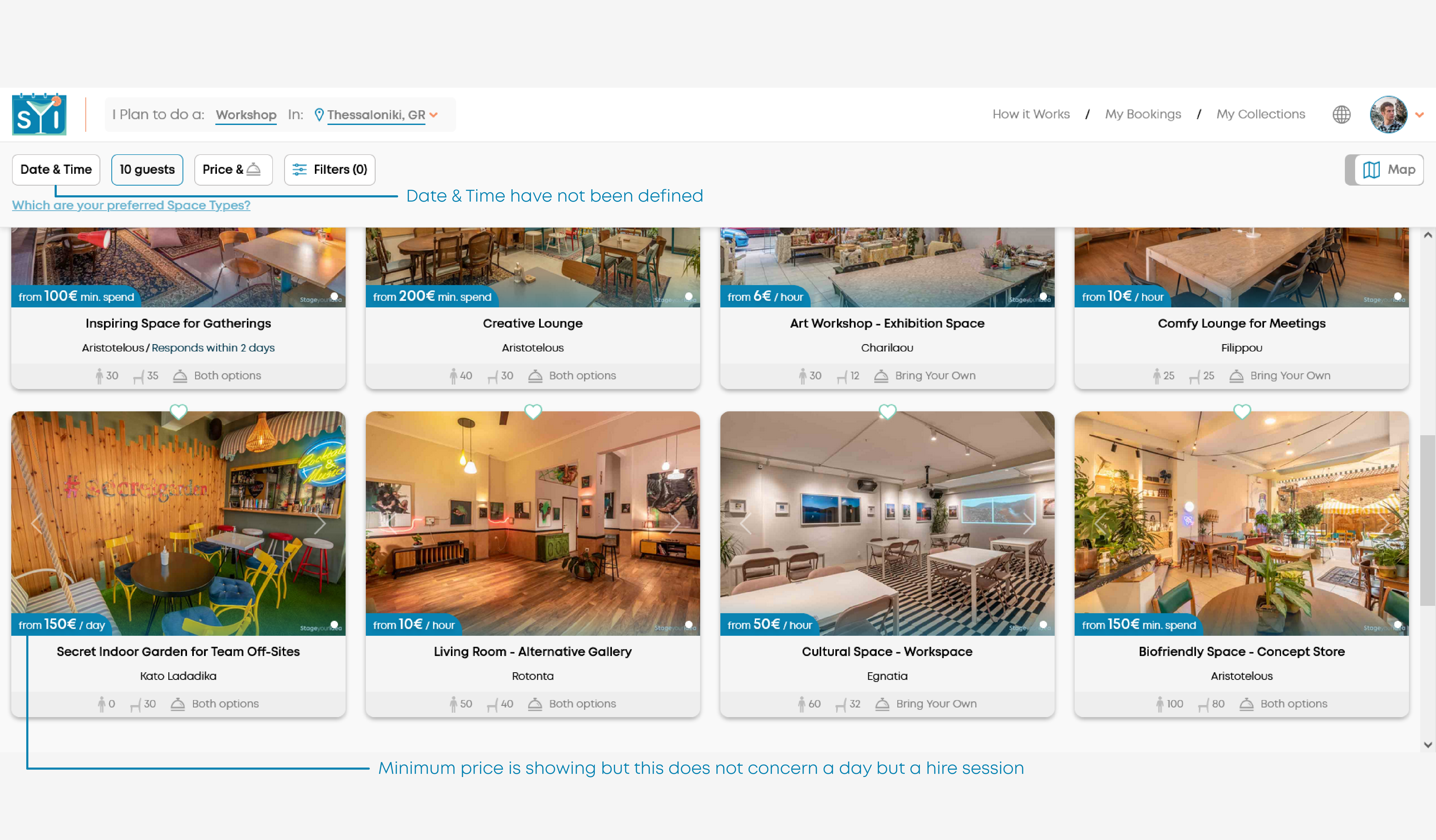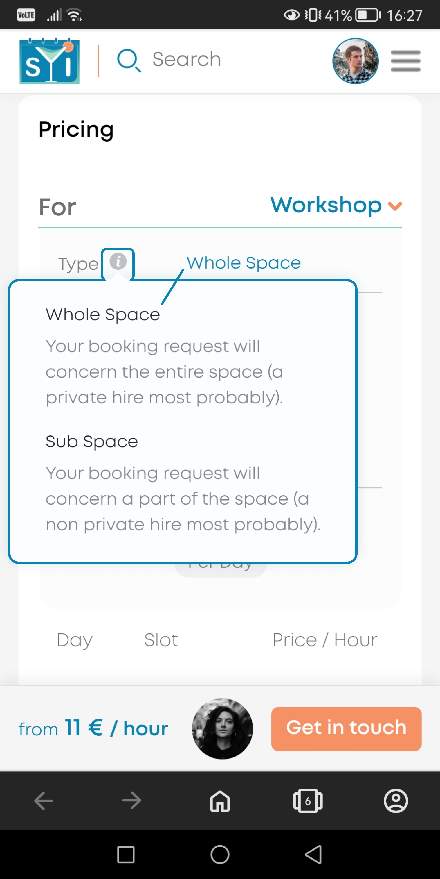 In the desktop view of our web app, the Request box, where Venue Host’s photo can be seen, is linked with the ‘Pricing’ section meaning when you enter your desired date & time, the pricing preview (blue box where €€ is shown) will be updated according to your selected options.