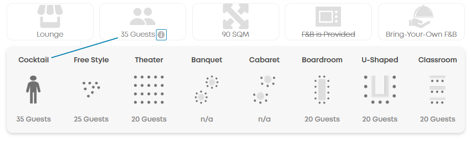 nfo icon when clicked reveals capacities per arrangement type (n/a = 'not available' layout)