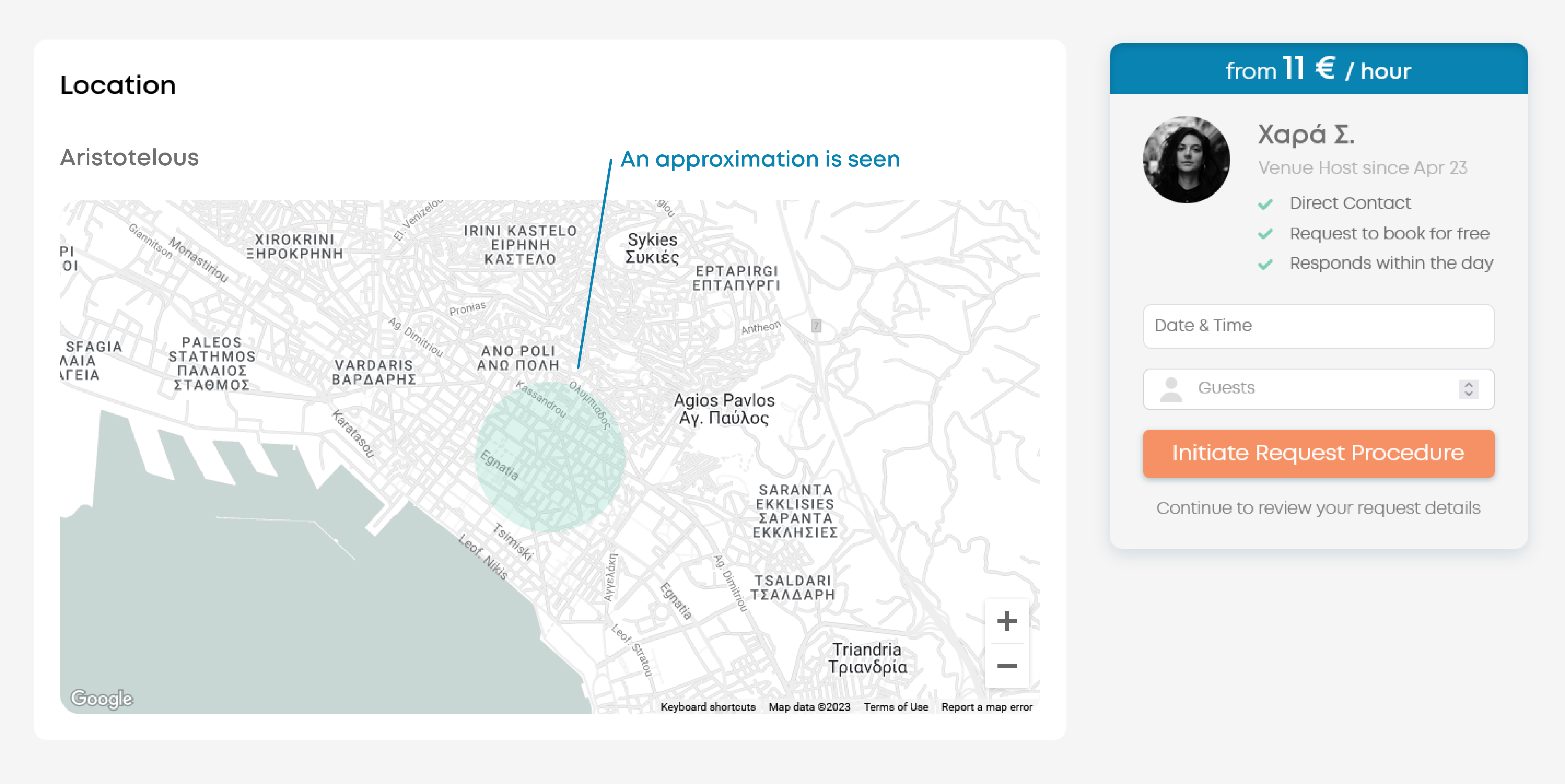 The exact location of the Space is disclosed by the Venue Host once you have proceeded to book the Space (a -free- step following your free availability request). What you get to see in the corresponding ‘Location’ section of the Space page is an approximation of the area.
