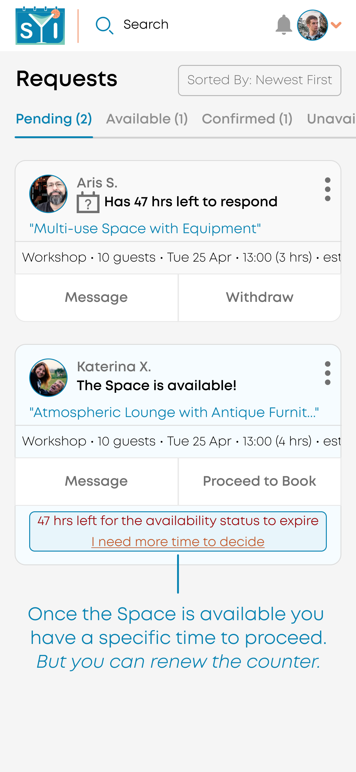 If the Space is available, you will get to communicate (through direct message) and ask anything additional that you may want or it might be that the Venue Hosts have questions for you. Open up your messages to check.
