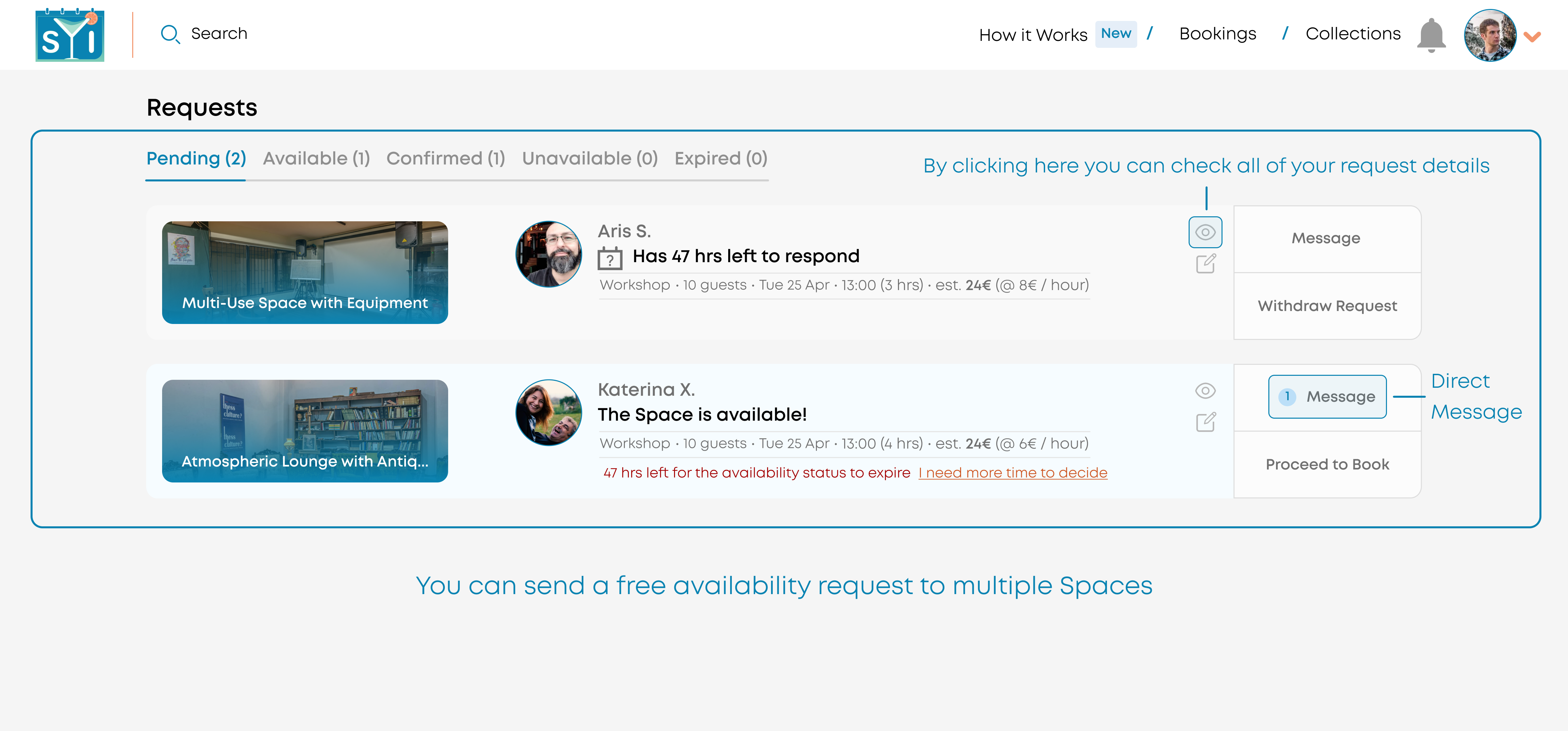 When you send any kind of request, Venue Hosts have 2 days to respond to you or else your request expires. Venue Hosts get notified by email and mobile message as soon as you press the sending button.